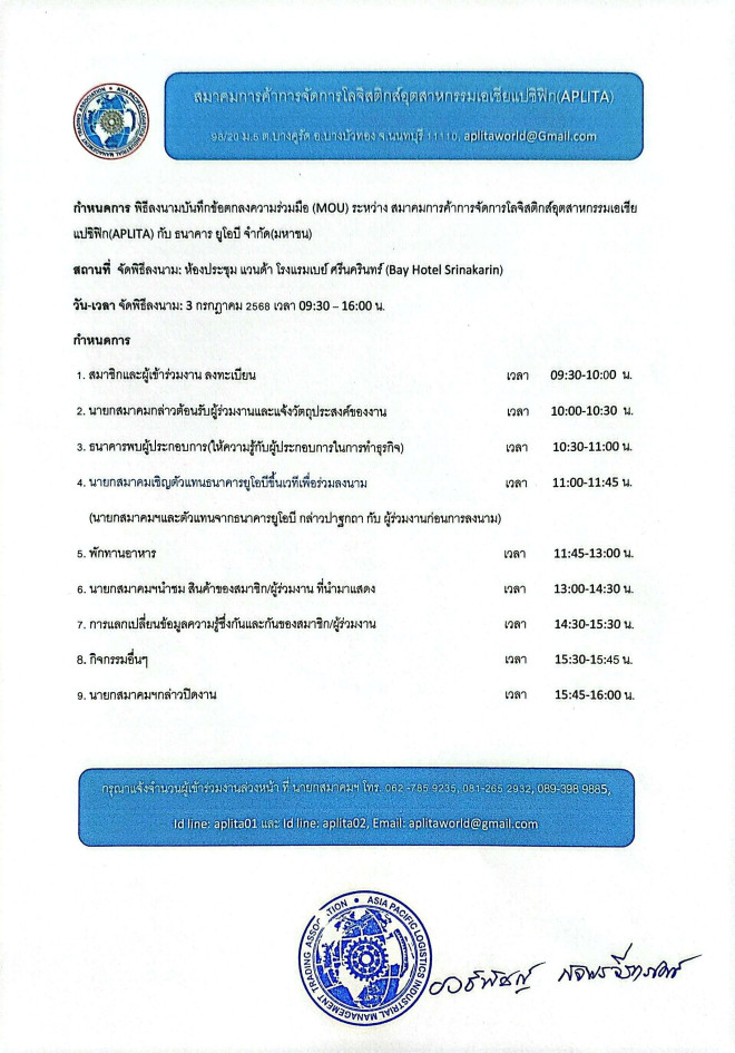 นายกสมาคมการค้าการจัดการโลจิสติกส์อุตสาหกรรมเอเชียแปซิฟิกและนายกสมาคมการค้านักธุรกิจสากล ได้ลงนามร่วมกัน ในโครงการความร่วมมือทางวิชาการเพิ่อพัฒนาทรัพยากรมนุษย์ ภาค การฝึกอบรมการใช้ภาษาต่างประเทศเพื่อการสื่อสารของประชาชน