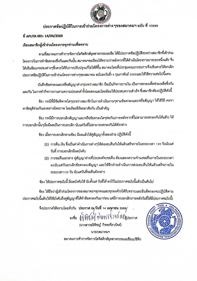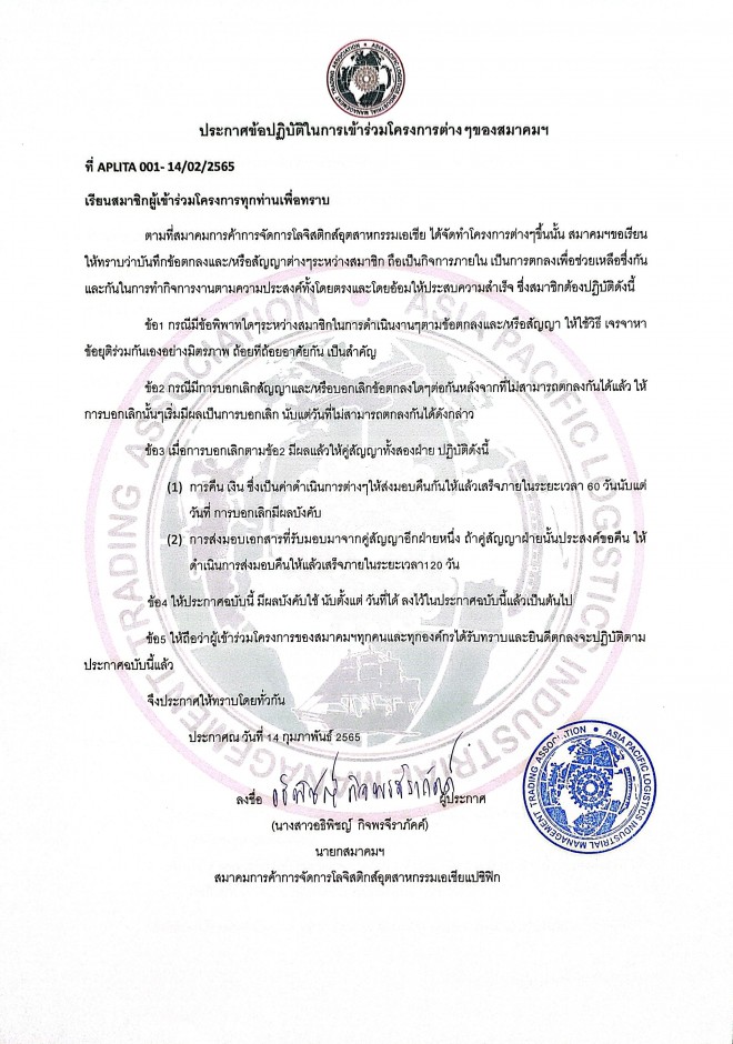 ประกาศสมาคมฯ ที่APLITA-14/02/2565