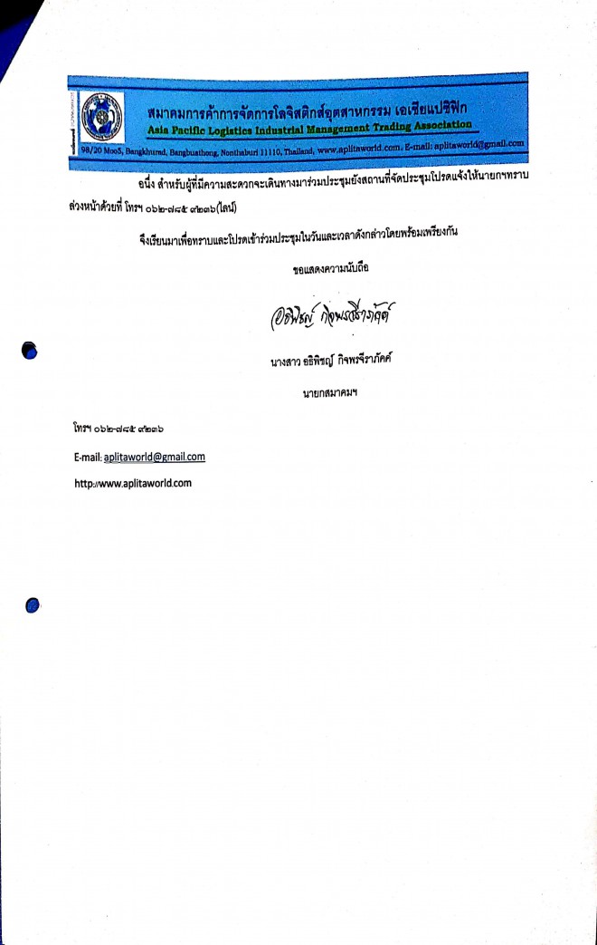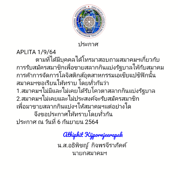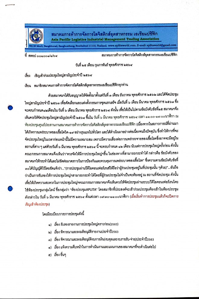 สมาคมฯจะจัดประชุมฯในวันที่6มีนาคม2564 เวลา11:00-14:00น. ณ ศูนย์ประสานงานสมาคมฯ เลขที่3196 ซ.สุขุมวิท107(ด่านสำโรง50/41) อ.เมืองสมุทรปราการ 10270 โดยใช้การประชุมผ่านระบบวีดีโอ คอนเฟอร์เรนซ์ ทางกลุ่มไลน์เป็นหลัก ชื่อกลุ่ม "ห้องประชุมAPLITA"