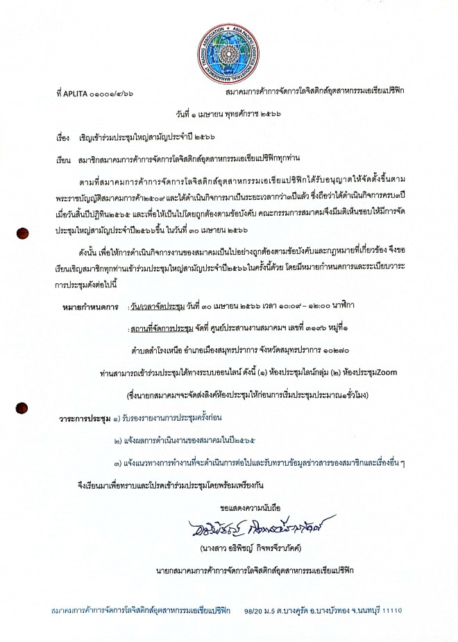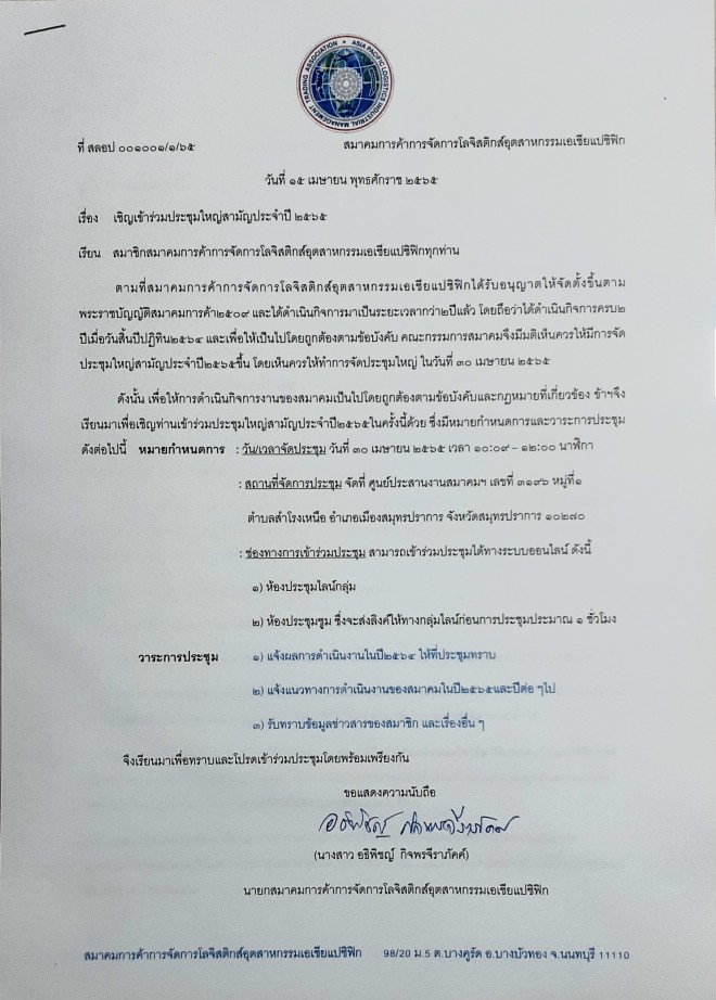 สมาคมขอแจ้งให้สมาชิกทุกท่านทราบว่า สมาคมจะมีการจัดประชุมใหญ่สามัญประจำปี2565ในวันที่30/04/65 ตามภาพหนังสือต่อไปนี้