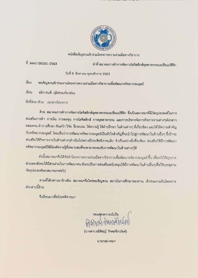 | ผู้จัดทำโครงการ | : สมาคมการค้าการจัดการโลจิสติกส์อุตสาหกรรมเอเชียแปซิฟิก(APLITA) (โดยมติที่ประชุมคณะกรรมการสมาคมฯ ครั้งที่01/07/2563) |